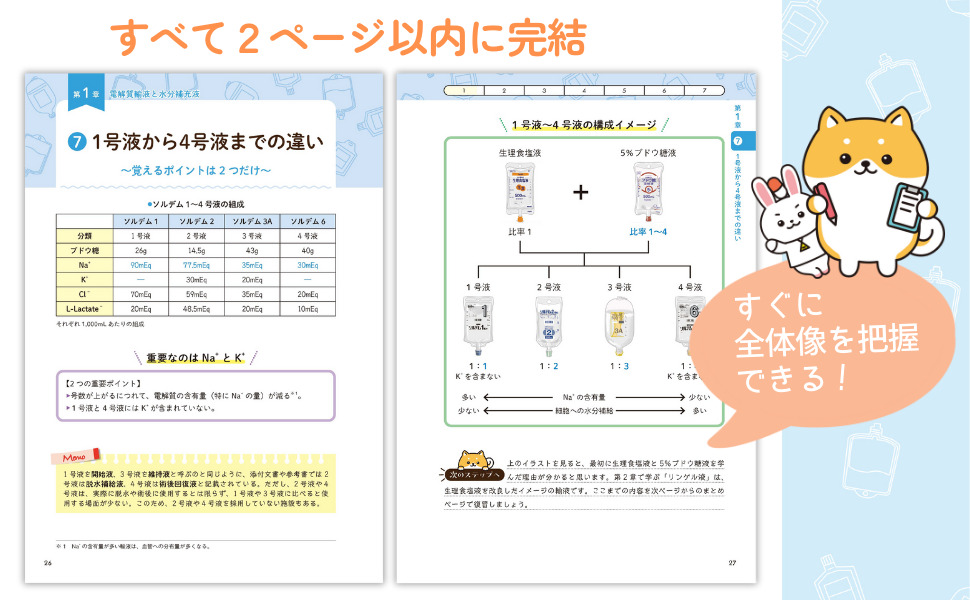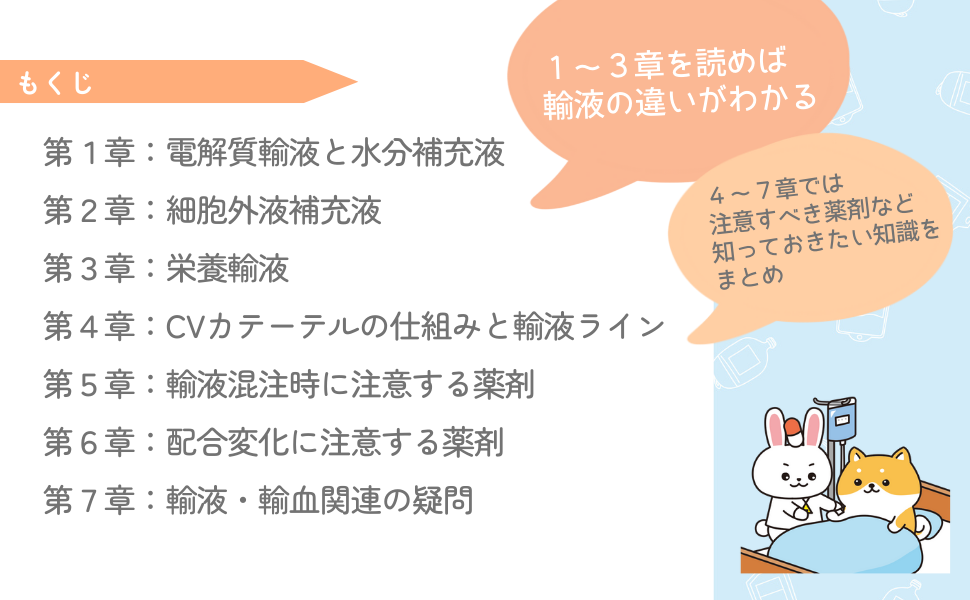 まさに、本書は看護師さんや薬剤師さんが輸液の違いを最短で学べる、輸液を学ぶ最初の一冊としてかなりオススメできる内容になっていると思います。